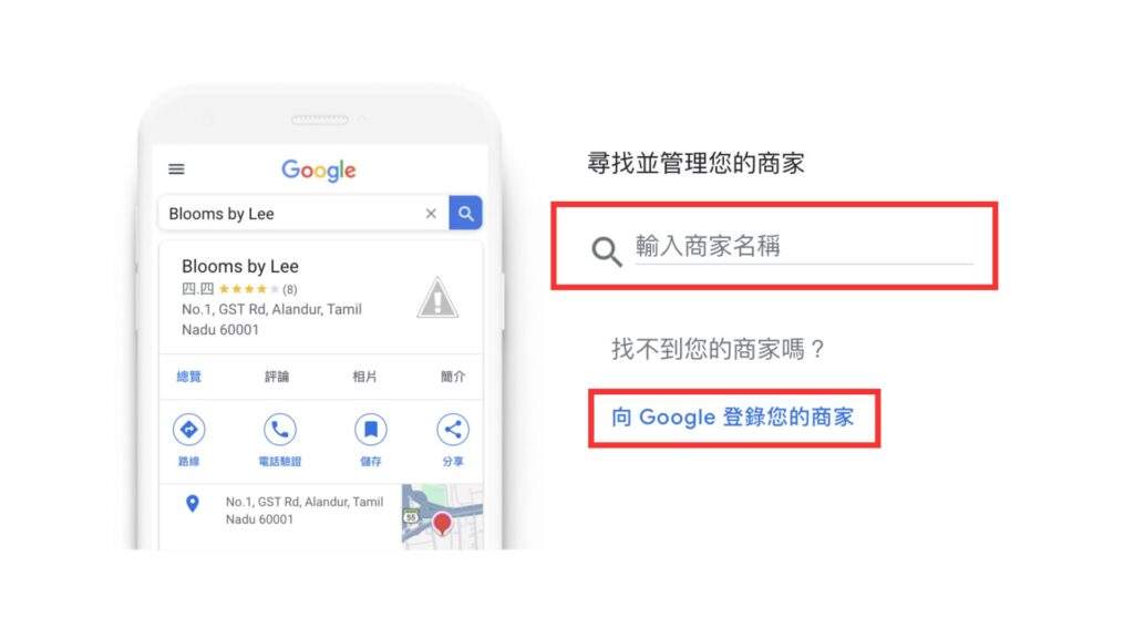 輸入商家名稱後,點擊「向 Google 登錄您的商家」,即可開始建立新的商家檔案